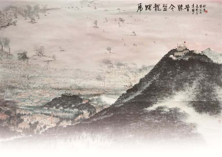 1949年4月23日,人民解放军占领南京。毛泽东闻讯后,欣然写下这首诗,描写了人民解放军横渡长江、解放南京的雄伟壮阔、气势磅礴场面。在画作中,画家描绘的是南京城的壮丽景色,沐浴在朝晖之中的紫金山及其周围景致,以浪漫的诗意呈现出来。近处,紫金山巍峨高耸,天文台亦清晰可见;中景,江上轮渡往来,两岸工厂林立,烟雾缭绕;远处,红霞烂漫,水天一色。新中国成立后的南京繁忙而祥和,墨色淋漓间,新中国欣欣向荣的景象跃然纸上。
