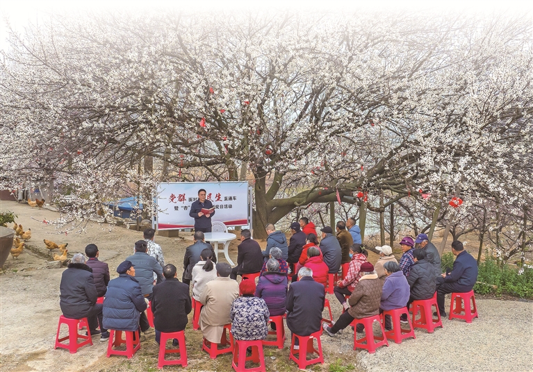 在江苏省泗洪县双沟镇中潼村,“党群面对面 民生直通车”主题党日活动举行,党员干部与群众面对面交流。 图片来源:视觉中国