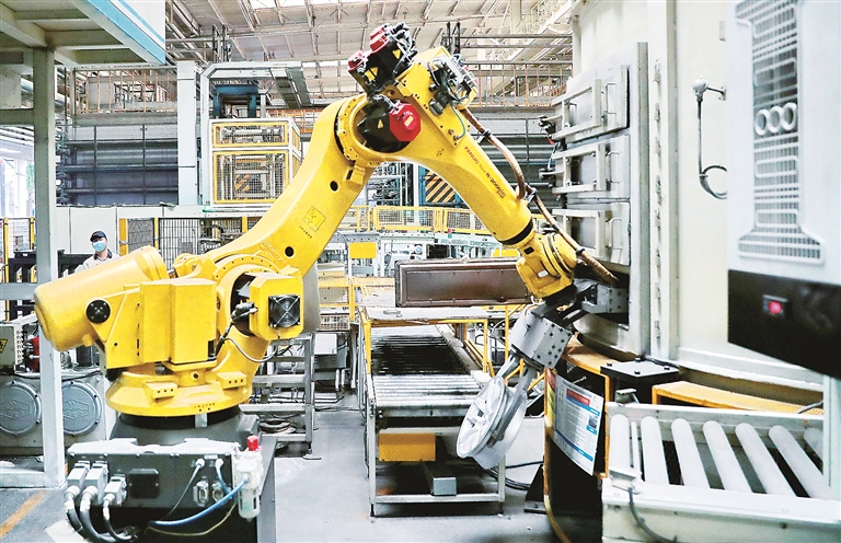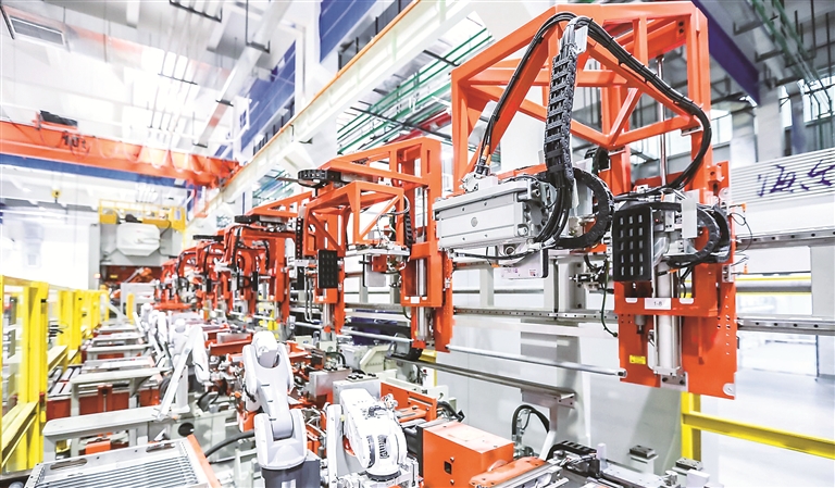 河北省秦皇岛市一家“灯塔工厂”车间内的巨型机械臂。图片来源:视觉中国