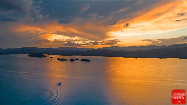 在三伏天的高温中,落日熔金,湖面碧波荡漾,夜游船来回穿梭在杭州千岛湖畔,观赏霞光万丈的日落美景。(国网杭州供电公司纪委 王鑫 摄)