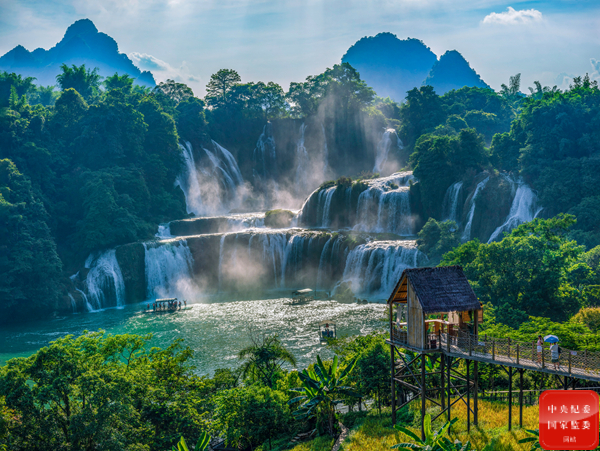 盛夏时节,广西壮族自治区大新县德天瀑布进入丰水期,浩浩荡荡的归春河水从山崖上跌宕而下,撞在坚石上,水花四溅,水雾朦胧,水声振荡河谷,场面蔚为壮观。(广西壮族自治区宾阳县纪委监委供 曾祥忠 摄)