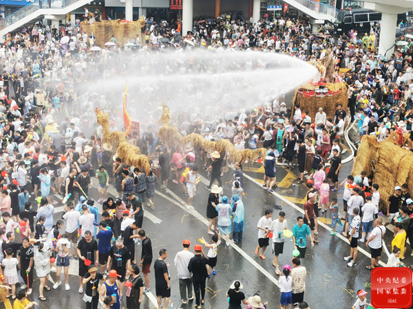 盛夏七月,热情似火。贵州省德江县癸卯年六月六“水龙节”活动在县城如期举行。烈日当空,人们泼的水挥洒成瓢泼大雨,水车也前来助兴,舞动的草龙穿梭其中,奔走追逐的人群尽情欢闹。(贵州省德江县纪委监委供 覃冠中 摄)