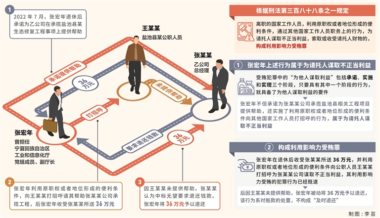 其中,2022年7月,张宏年在退休后接受乙公司总经理张某某请托,承诺为乙公司在承揽盐池县某生态修复工程事项上提供帮助,后张宏年利用曾担任宁夏回族自治区工业和信息化厅党组成员、副厅长职权或者地位形成的便利条件,向盐池县某公职人员王某某打招呼,请其对乙公司中标相关工程项目给予关照。张宏年收受张某某所送现金36万元。因王某某未提供帮助。一周后,张某某认为中标无望要求退还钱款,张宏年将36万元予以退还。