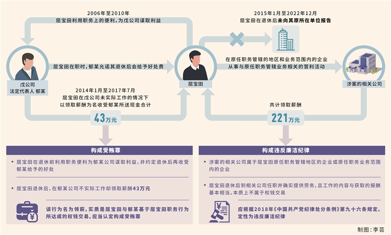 屈宝田退休后在乙公司等公司任职并领取薪酬221万元,为何认定为违反廉洁纪律?其在郁某公司领取薪酬,为何认定为受贿?