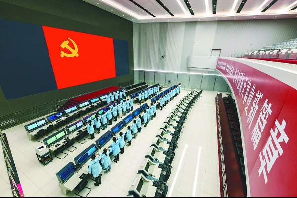 图为北京航天飞行控制中心青年科技人才群体在党旗下宣誓。 (北京航天飞行控制中心供图)