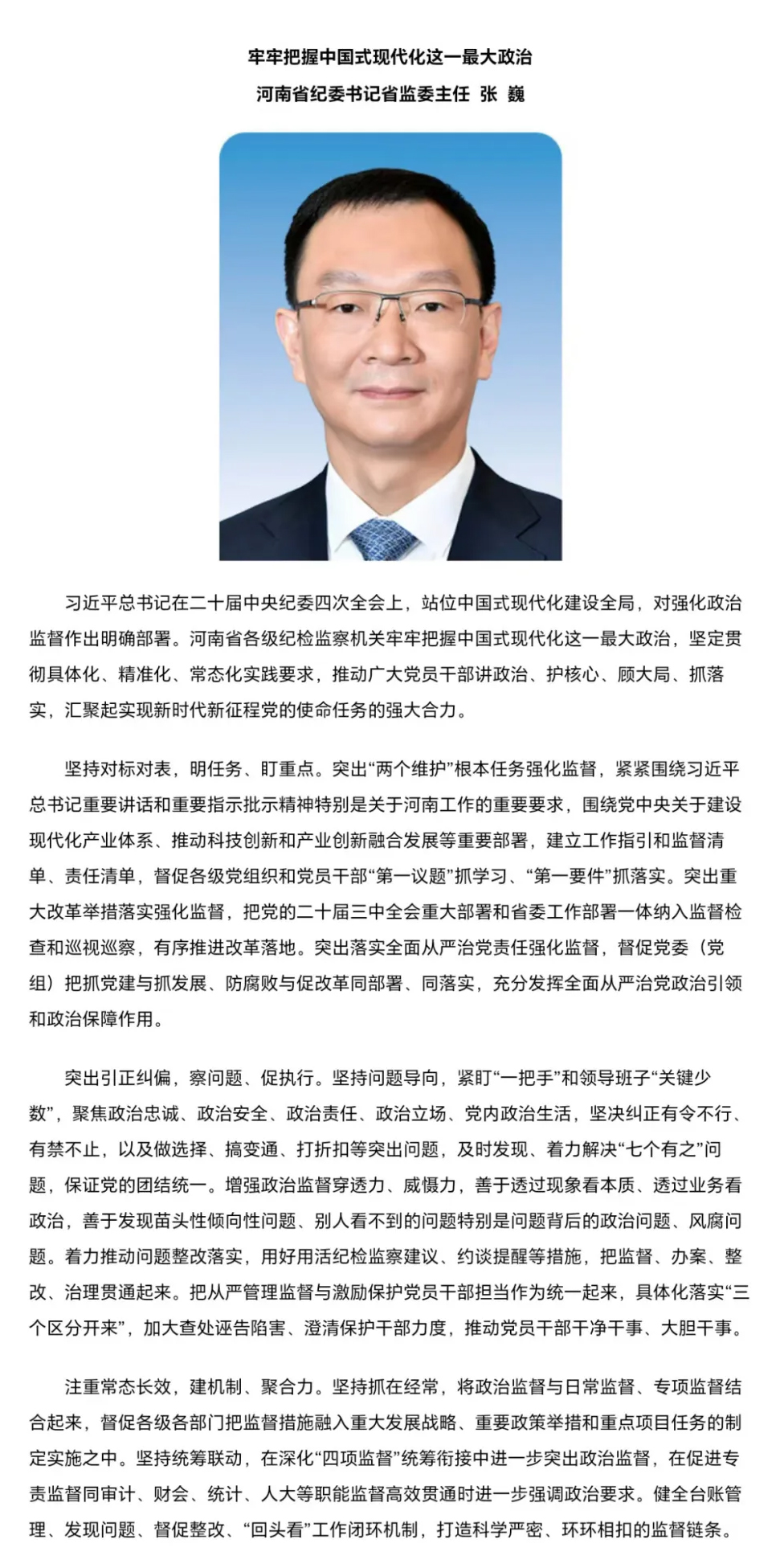 2025年第2期《中国纪检监察》杂志“聚焦‘两个维护’ 强化政治监督”专栏刊发河南省纪委书记、省监委主任张巍署名文章《牢牢把握中国式现代化这一最大政治》。