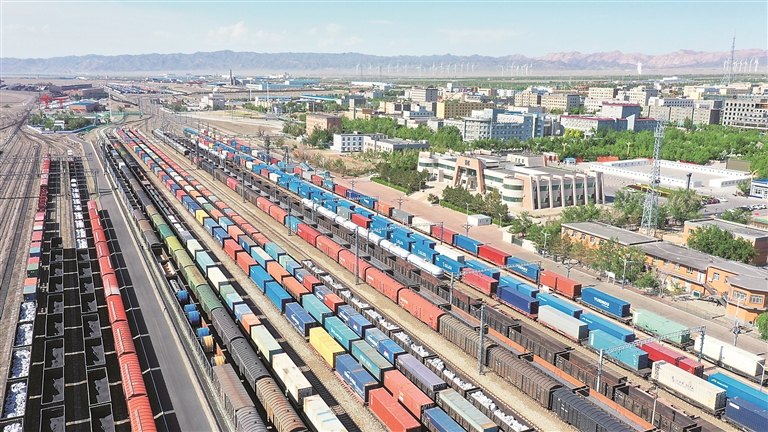 中国式现代化是强国建设、民族复兴的康庄大道,开辟的是人类迈向现代化的新道路,开创的是人类文明新形态。图为近日,在新疆阿拉山口站宽准轨编组场,出入境中欧班列集结等待出发。新华社发