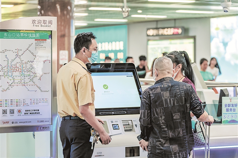 10月9日,广东省广州市,地铁工作人员引导乘客使用智能化乘车系统。