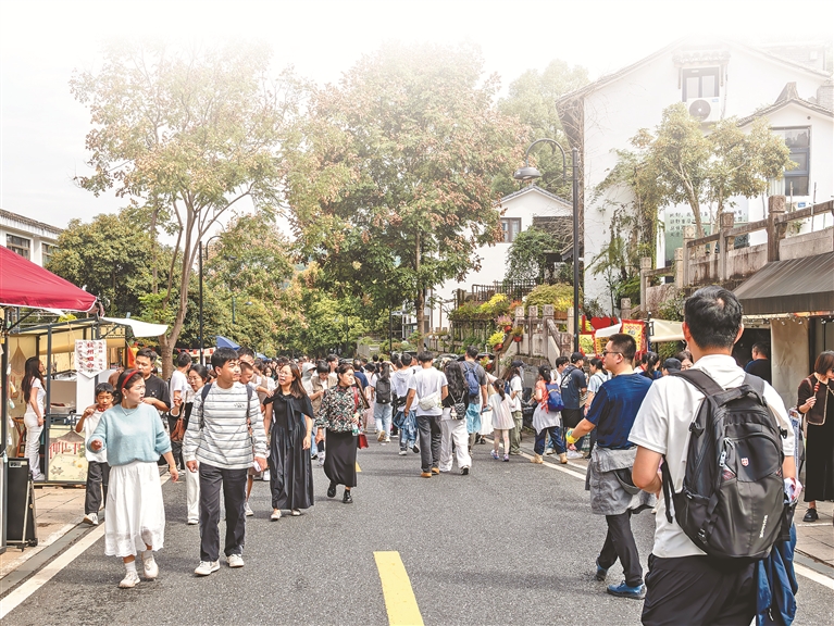 行走在浙江省杭州市,可感受历史与现代的交织融合,自然与人文的和谐共生。图为10月13日,杭州满觉陇路桂花盛开,游人如织。图片来源:视觉中国