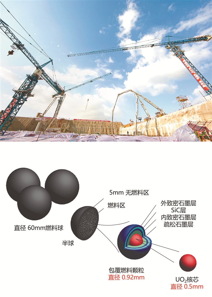上图:石岛湾高温气冷堆核电站示范工程核岛第一罐混凝土浇筑。下图:耐高温的球形燃料元件内部构造示意图。