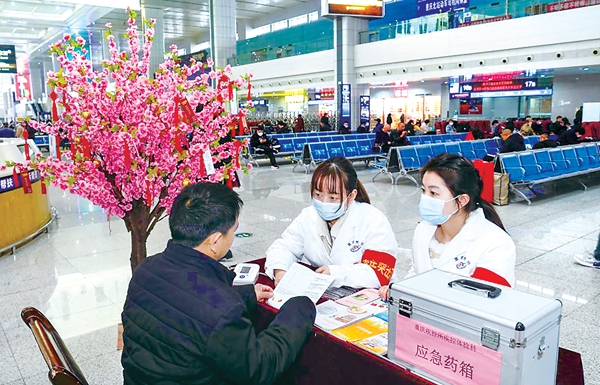 下图:3月1日,在重庆北站北广场(重庆火车站下辖车站)候车室内,“学雷锋志愿服务队”成员在为旅客提供义诊服务。新华社记者 刘潺 摄