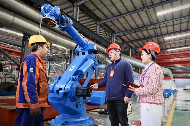 河南省舞钢市纪委监委紧盯惠企政策落实、项目审批落地、涉企服务质效等关键环节,着力破解企业在改革发展、产业转型升级过程中的“中梗阻”。图为该市纪检监察干部在某机械公司了解涉企服务情况。朱莞尔 摄