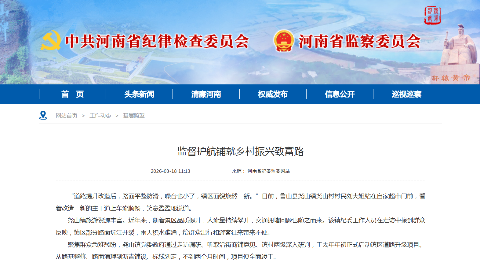 农村公路是乡村振兴的“毛细血管”。近年来,鲁山县纪委监委深化运用“室组”“室组地”协同联动机制,通过实地查看、走访调查、查阅资料等方式,紧盯农村公路改造中的项目进度、工程质量、资金使用、工作作风等关键环节,压紧压实职能部门主体责任,确保项目廉洁高效推进,方便群众生产生活。截至目前,鲁山县农村公路通达里程3600余公里,道路通畅率100%。