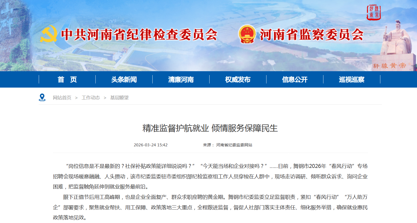 眼下正值节后用工高峰期,也是企业全面复产、群众求职应聘的黄金期。舞钢市纪委监委立足监督职责,紧扣“春风行动”“万人助万企”部署要求,聚焦就业帮扶、用工保障、政策落地三大重点,全程跟进监督,督促人社部门落实主体责任、细化服务举措,确保就业惠民政策落地见效。