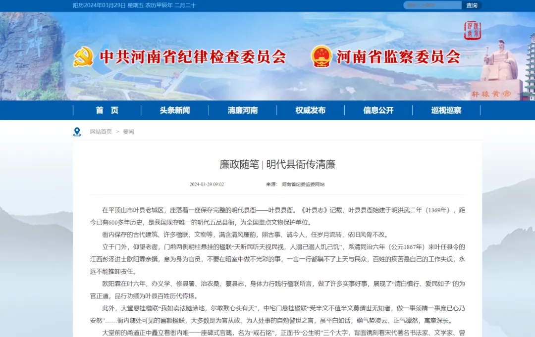 县衙的故事不只欧阳霖、黄庭坚,他们与曾在这座县衙为官的明代宋玺、李克浊、黄嘉善,清代柏之模等廉吏一道,谱写了叶县历史上的“清官史话”,向后世不断传递着清风正气,值得今天所有党员干部传承弘扬。
