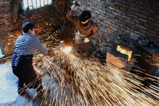 一锤接着一锤打,火星四射。“打铁必须自身硬”,铁匠们不仅继承着先辈过硬的铸铁技术,还练就了过硬的身体,在日复一日在铁火中淬炼人生,锤打出亮堂堂的铁具。