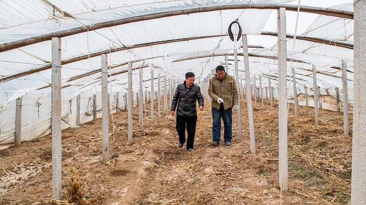 王希法来到贫困户张留宝家的大棚。张留宝正在加固整修大棚,准备种植新一季的蔬菜。王希法嘱托他要瞅准市场需求,不能盲目种植,吸取上一季菠菜滞销的教训,如需技术指导,他帮助联系农技专家。