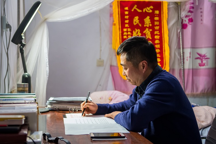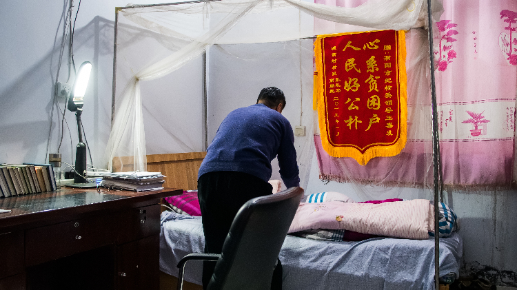 王希法按照习惯,起床叠被洗漱。春节刚过,天气没有转暖,豫北黄河边的农村格外的寒冷,由于电线老化空调不能使用。村委会的一间村室里,办公休息二合一,一张床、一张桌。床边墙上挂着的一张锦旗格外醒目。