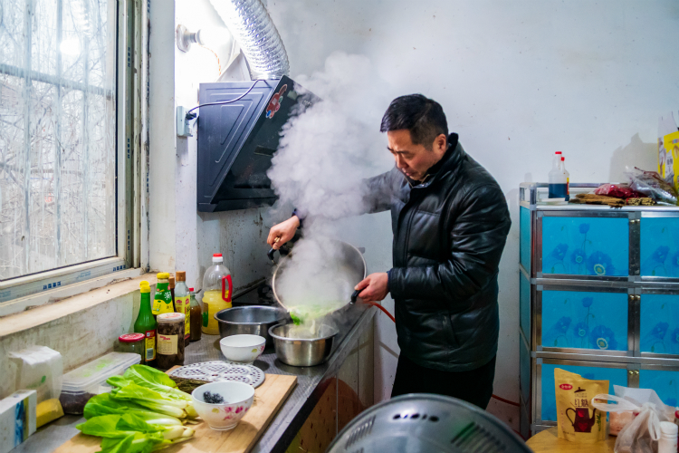 准备做早饭。王希法用冰冷的水洗菜,手冻得通红。怎样简单怎样来,一把面叶,放上小白菜和盐就是一顿早餐。