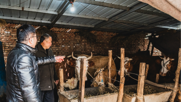 王希法正式开始了一天的工作。今天的第一站是贫困户王振华的养牛棚。2018年,王希法帮助老王争取到扶贫资金5万元,扶持老王养牛,让他尝到了甜头。老王去年卖了两头公牛,挣了两万多元,后又增加两头母牛,现在四头母牛都怀上了牛犊。王希法这次去老王家,一方面是了解养牛的情况,最主要的是给老王联系了市农业畜牧局的技术员杨家民。