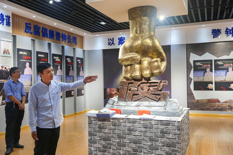 枪杆刘社区党支部书记陈艳峰在社区反腐倡廉警示教育基地,介绍身边发生过的案例
