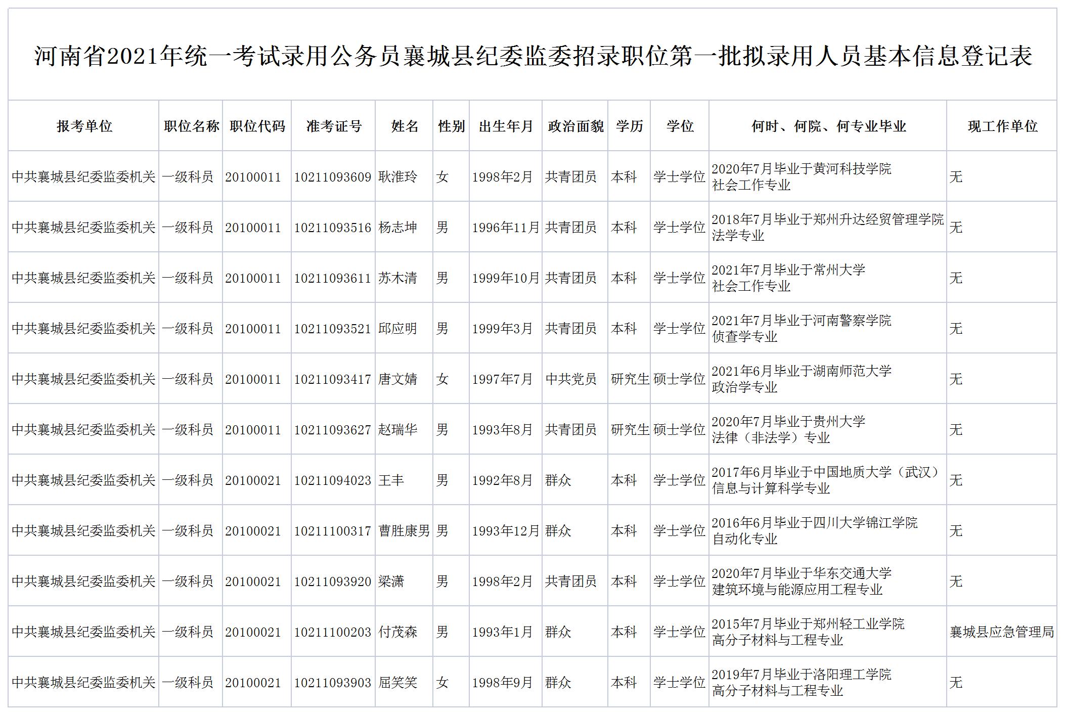 按照《中共河南省委组织部 河南省人力资源和社会保障厅关于印发<河南省2021年统一考试录用公务员工作实施方案>的通知》(豫组通〔2020〕51号)要求,经过报名、笔试、面试、体检(体能测评)、考察等程序,根据考试总成绩并结合考察情况,现将河南省统一考试录用公务员襄城县纪委监委招录职位第一批11名拟录用人员相关情况进行公示(见图片),公示期为2021年7月15日-21日(5个工作日)。