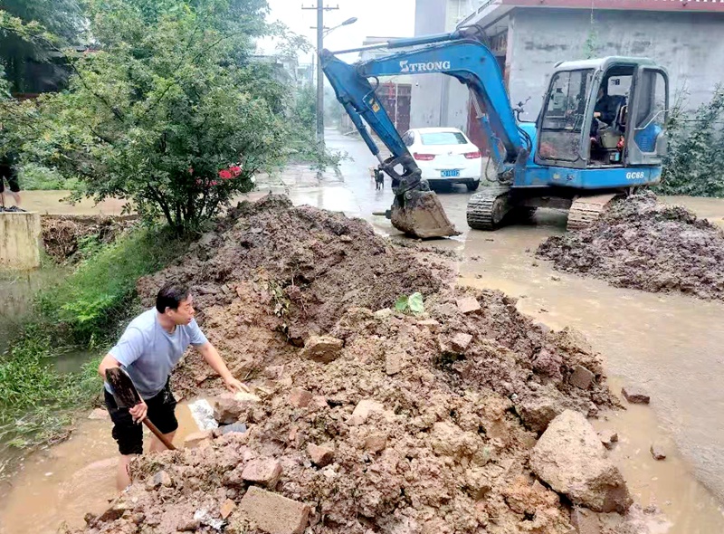襄城县茨沟乡纪检监察干部深入防汛一线,排查房屋安全和农田内涝排水问题。图为乡纪委书记白晓杰帮助群众疏通农田排水渠道。