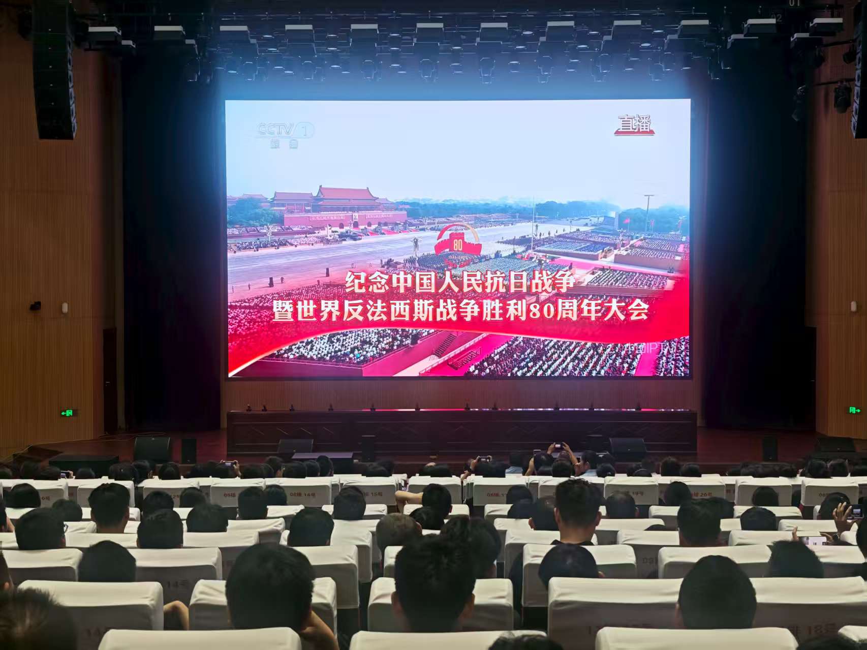 上午9时,全体人员就坐,目光紧紧聚焦大屏幕,认真聆听习近平总书记重要讲话,见证阅兵所有环节。雄壮的国歌响彻云霄,主席的讲话铿锵有力,飒爽的方阵整齐划一,先进的装备武器呼啸而过,每一个画面都让人热血沸腾、心潮澎湃,现场观众深受鼓舞,不时爆发出热烈的掌声。