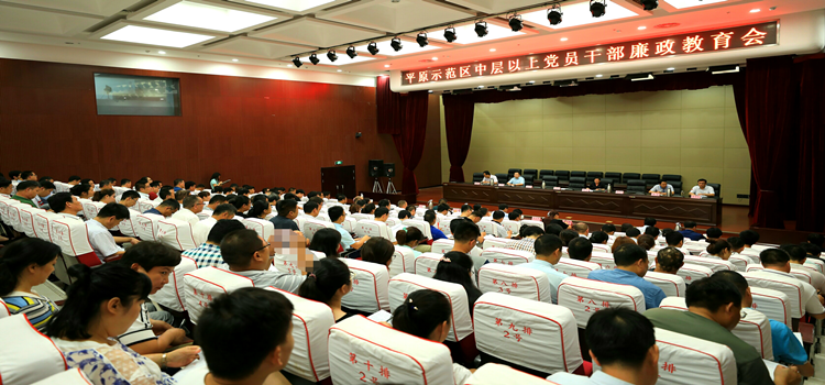8月20日下午,“平原示范区中层以上党员干部廉政教育大会”召开。参加会议的有示范区副处级以上干部,各局(办)科室主任、主办以上党员干部,税务、安监(含工商、质检)、公安、国有公司班子成员及各乡(镇)副科级以上干部。市政府党组成员、示范区党工委书记鹿建宇作了重要讲话,示范区纪工委彭传胜书记进行了廉政讲课。