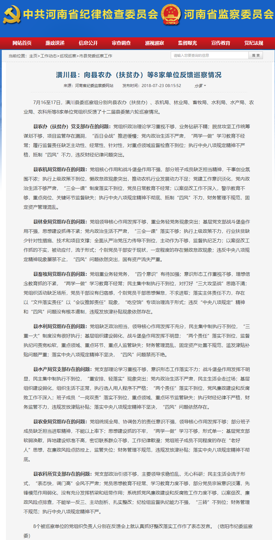 【省纪委网站信息】潢川县:向县农办(扶贫办)等8家单位反馈巡察情况