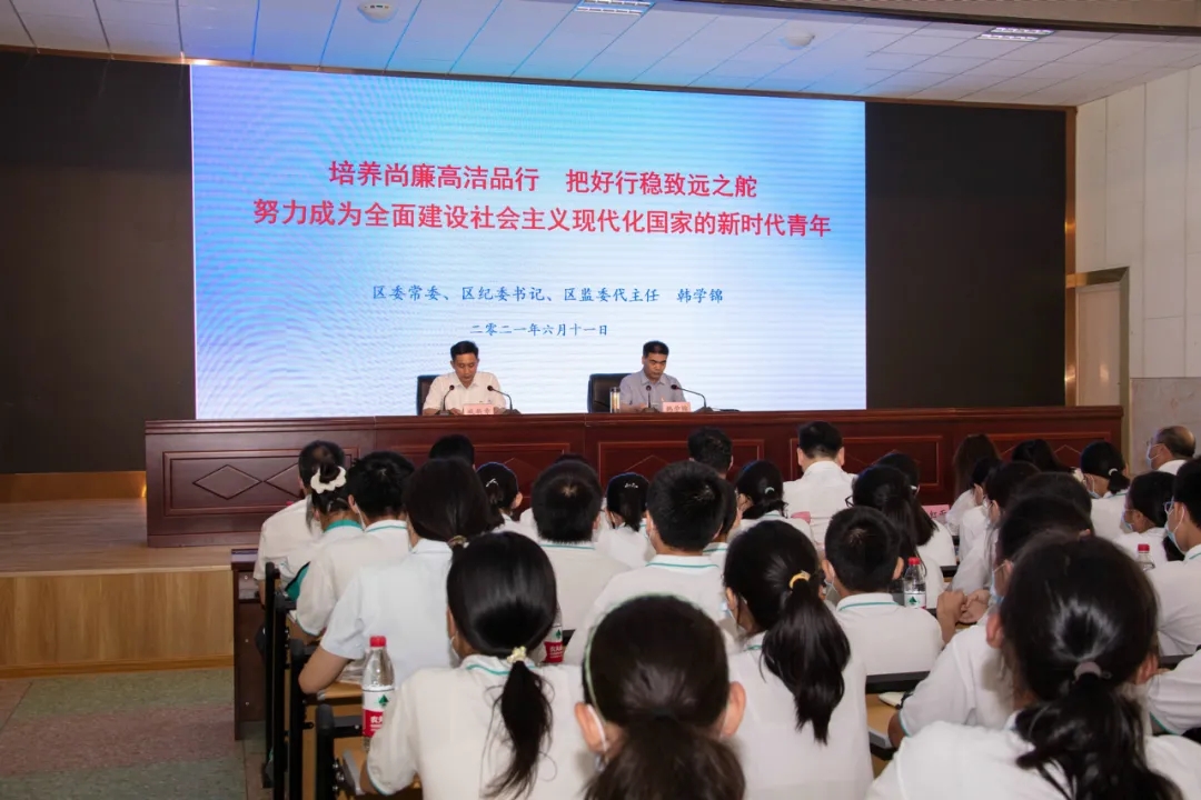6月11日,区委常委、区纪委书记、区监委代主任韩学锦在驻马店第四中学以《培养尚廉高洁品行 把好行稳致远之舵 努力成为全面建设社会主义现代化国家的新时代青年》为题,给全区教育系统部分师生上了一堂思想政治课。
