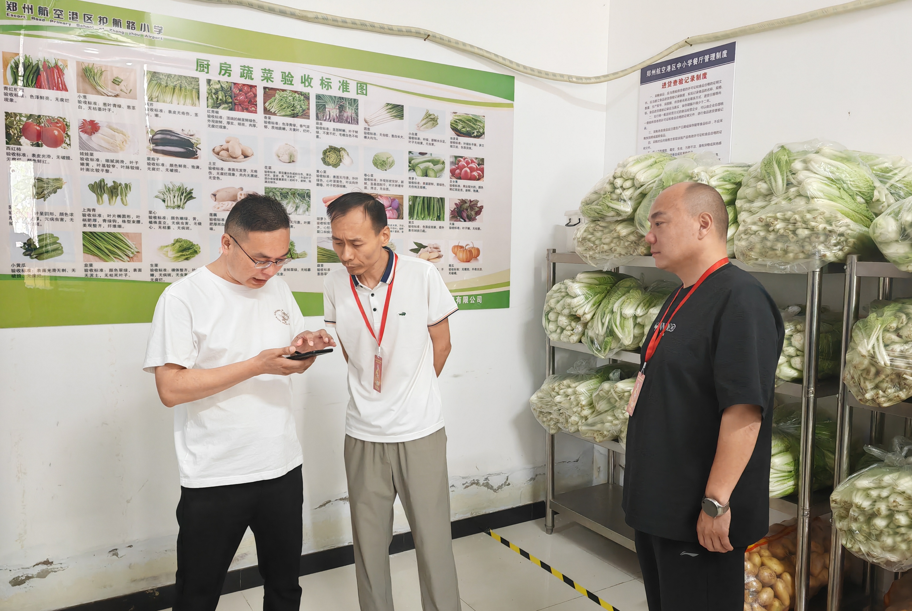 航空港区纪检监察工委聚焦校园食品安全问题,深入辖区中小学、幼儿园开展专项监督检查,护航师生“舌尖上的安全”。图为该区教育系统专项整治工作组在郑州一中国际航空港实验查看食材采购、配送情况。